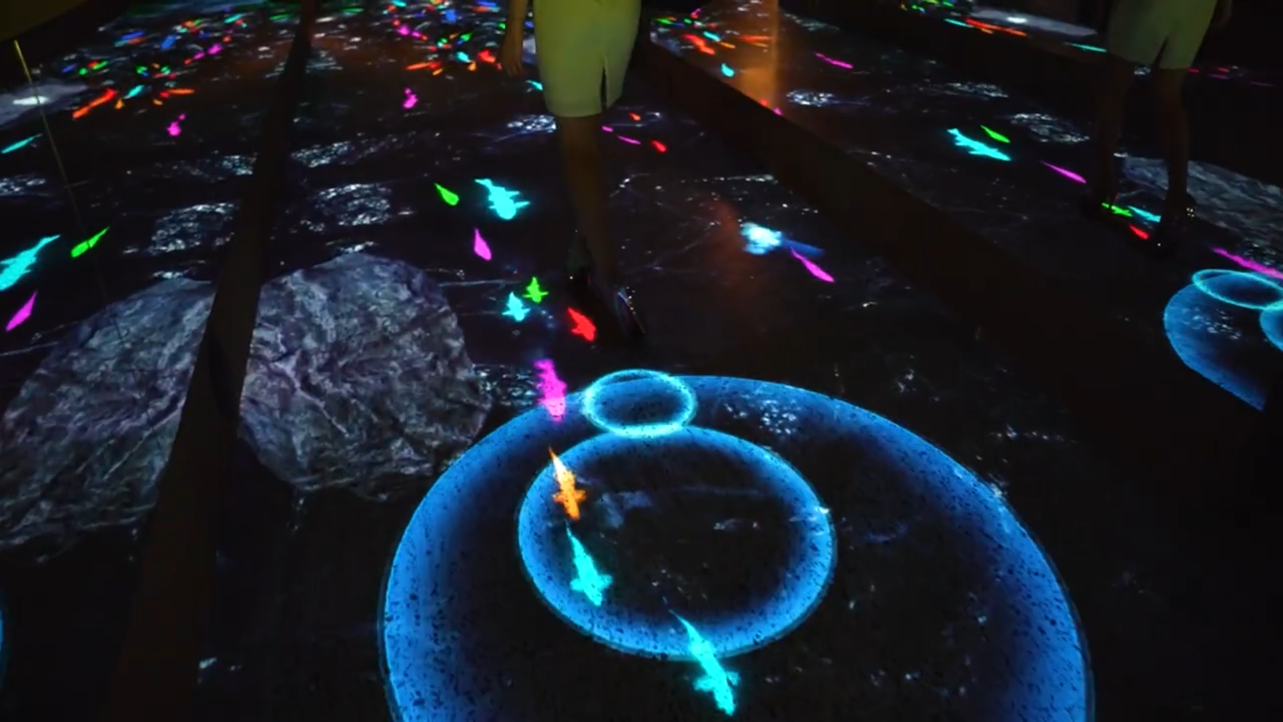 川のせせらぎやカジカガエルの鳴き声とともに、来店者の動きに反応して波紋が広がり、カエルが飛び込む・魚が逃げるなどの体験型コンテンツを展開しました。